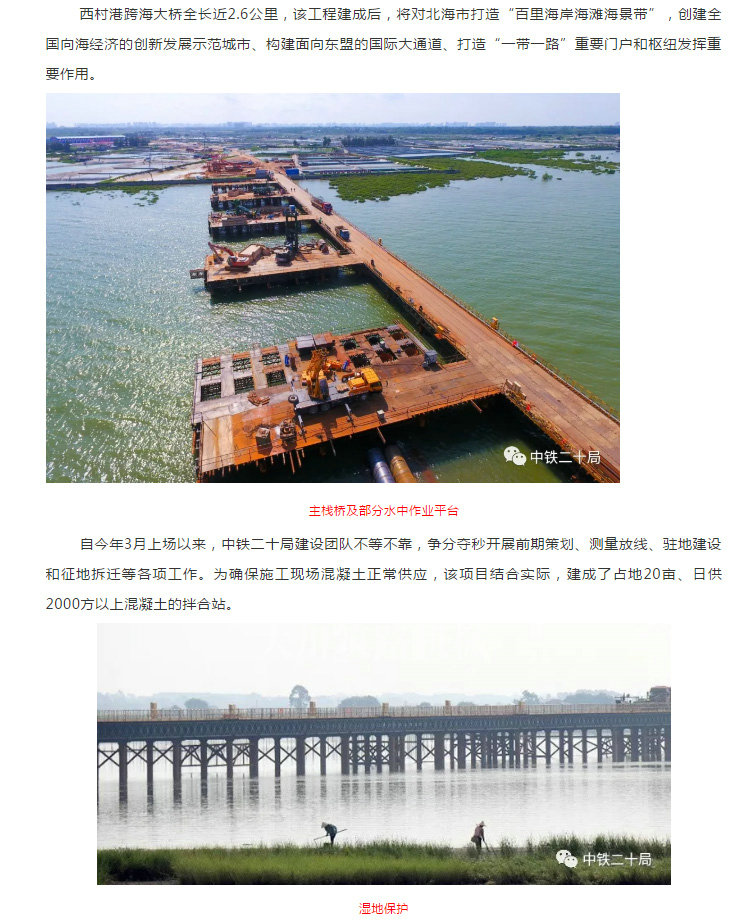 該工程緊鄰北海銀灘東區(qū)海濱濕地公園,棲息著蒼鷺、剪尾、招潮蟹、海桑、鹵蕨等數(shù)十種動植物,生態(tài)保護壓力巨大。中鐵二十局建設者在施工中全面推行工地除塵、棧橋降溫、濕地防護等保護措施,精心做好生態(tài)保護工作。