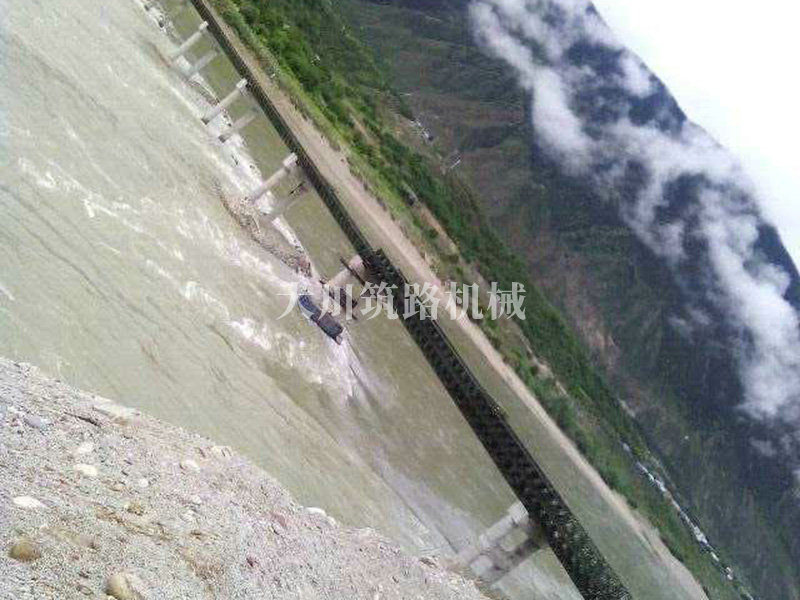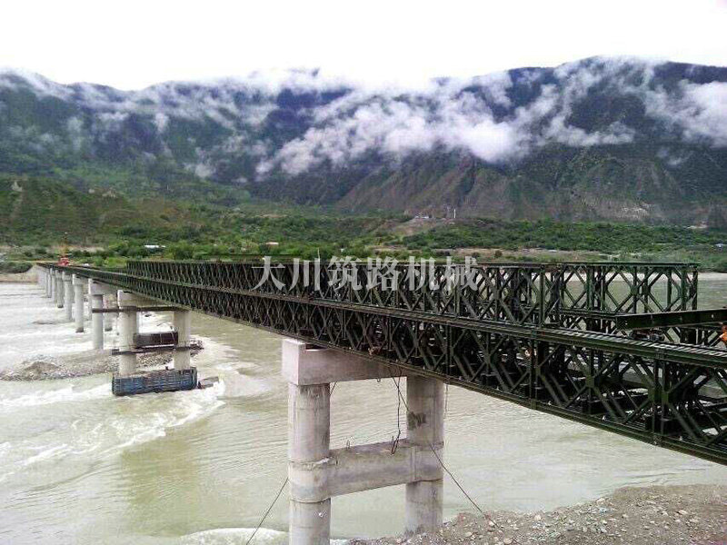特點(diǎn):本鋼橋拉薩到林芝鐵路控制性工程的重要組成部分,滿足荷載80T施工車輛通行。主河道水流急,橋墩高,經(jīng)多方多次論證和設(shè)計(jì),最后采用了24+24+24+42+42+24M三排雙層單層混合型加強(qiáng)型雙橫梁下承式鋼橋。克服了施工難度大、氧氣較稀薄等因難因素,采用推出法安裝,于2015年6月通車。